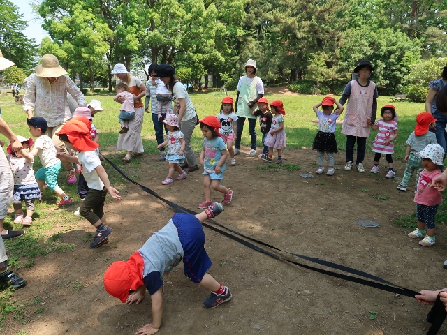 つくし組と幼稚園の園児たち、今日は一緒に若草公園で遊びました。りす組さん(3歳児クラス)のお友達とパラバルーンや猛獣狩り、草花遊びにシャボン玉、お魚作りにおさんぽなどなど、とても楽しい時間を過ごすことができました。