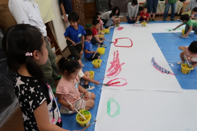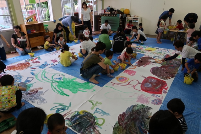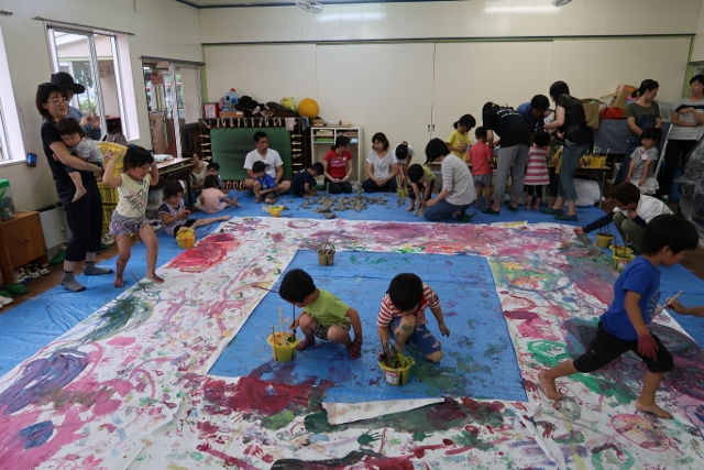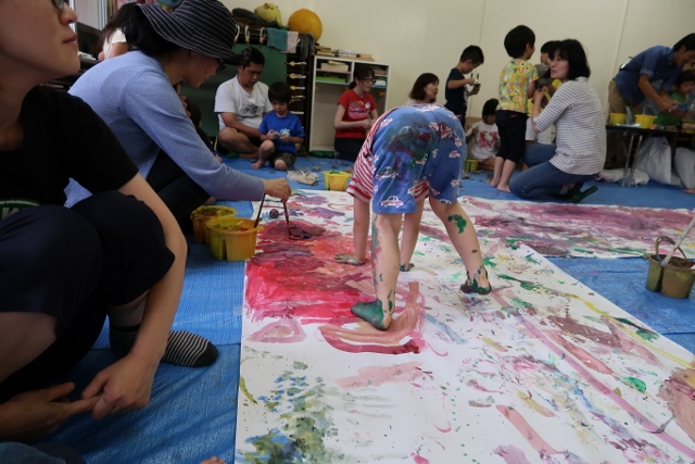 今日の講師の上村さんは「お絵描きではなく、絵具あそびをしよう」と言っていました。「こども達が今日はどんな面白いことを始めるか、楽しみです」とも言っていました。このようなこども達との関わり方は非常に大切な視点だと私も思っております。