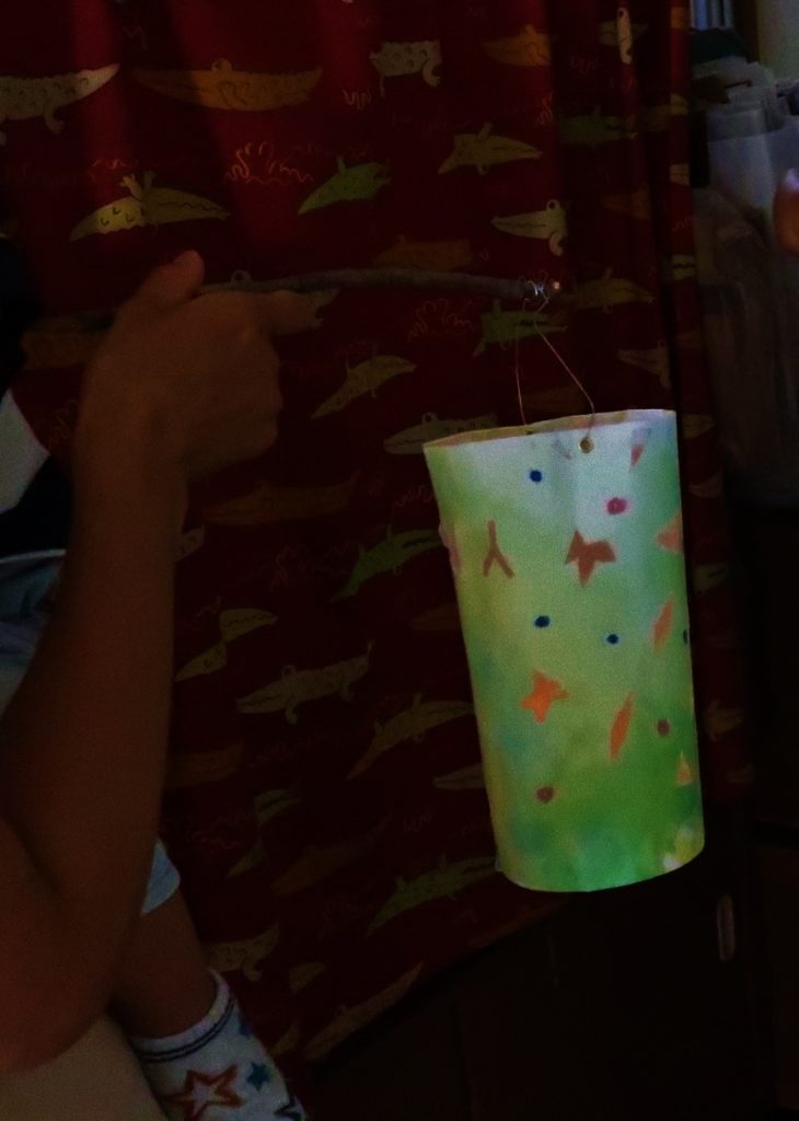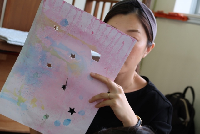 先週の絵の具あそびで作った画用紙を使用し、とっても素敵なカンテラができました。