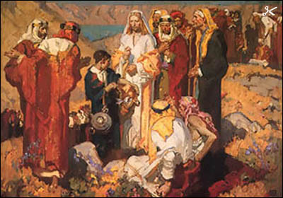イエスの弟子たちは解散するように提案するが「あなたたちが食べ物を与えなさい」とイエスに言われる。困り果てているところへ一人の少年が5つのパンと2匹の魚を持ってくる。「たったこれっぽっち」と周りの大人たちは思ったかもしれない。しかし、イエスは喜んだ。自分の持っているものを他人のために全部差し出した少年の気持ちを大切に受け取り、皆に配った。すると不思議なことにみんながお腹いっぱいになり余りが出るほどになった。自分のためだけじゃない、他人のことを純粋に思う心が大切。