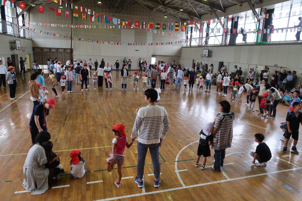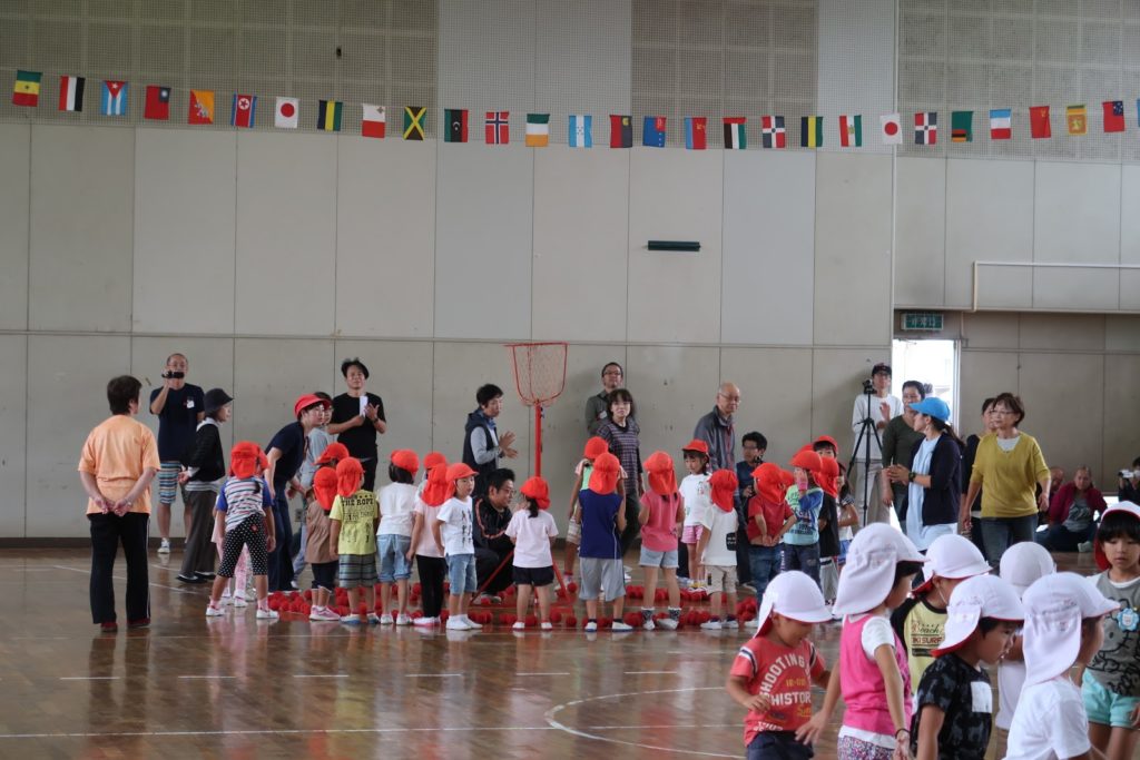 お父さんも、お母さんも、お兄ちゃんも、お姉ちゃんも、おじいちゃんも、おばあちゃんも、みんなが競技に参加してくださいました。こども達の目にはとても嬉しく映ったことと思います。お父さんたちの力も大きいものがありました。万国旗を体育館の中でも飾ろうといってくださったのはお父さんの方からでした。「人との関わりの中で人間は成長する」ことをしみじみと感じました。そして何よりこども達を取り巻く大人の目の温かいこと! 5年前、この青梅幼稚園に来た時から感じておりましたが、お父さんお母さんの目がとてもやさしいのです。この目の温かさはこの先どんな時代になっていっても変わらず、青梅幼稚園の文化として根付いていってほしいと思います。