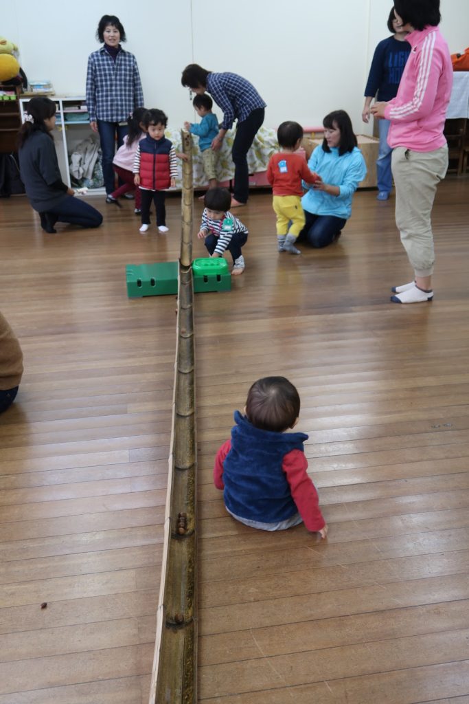 晴の日の解放感、すがすがしさもいいですが、雨の日のじわじわ来る楽しさを今日は味わえたような気がしました。どんぐりが転がるだけで面白かったり、雨が降っているのに外に出て行ってしまったり、ビーズをもくもくとヒモに通してみたり…。場所にも慣れてきていると思うのですが、みんなとっても表情が良かったように思います。