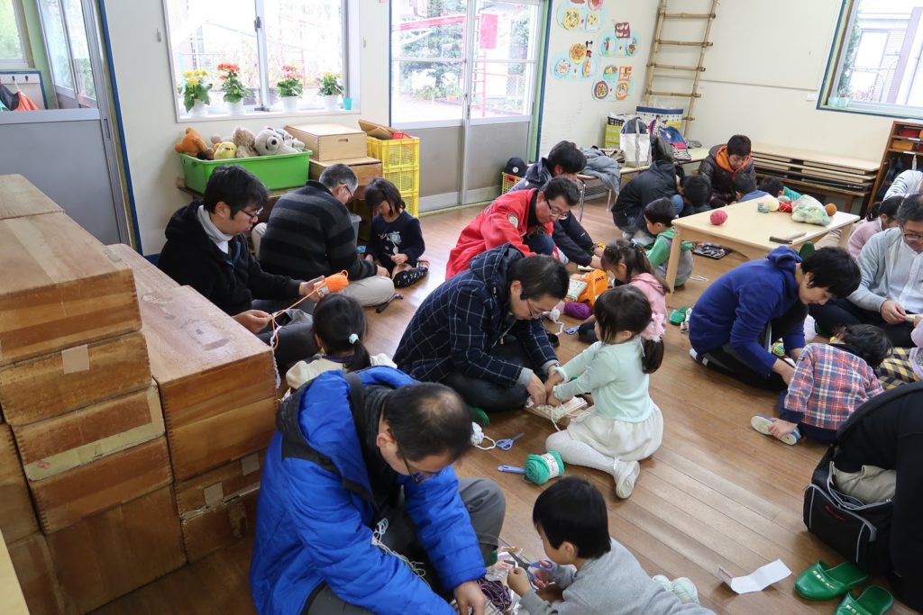 今日は祝日でしたが、青梅幼稚園では親子(主にお父さん)で遊ぶイベントを企画しました。ここ数年、「木」をテーマにのこぎりで切ったり釘を打ったりしています。