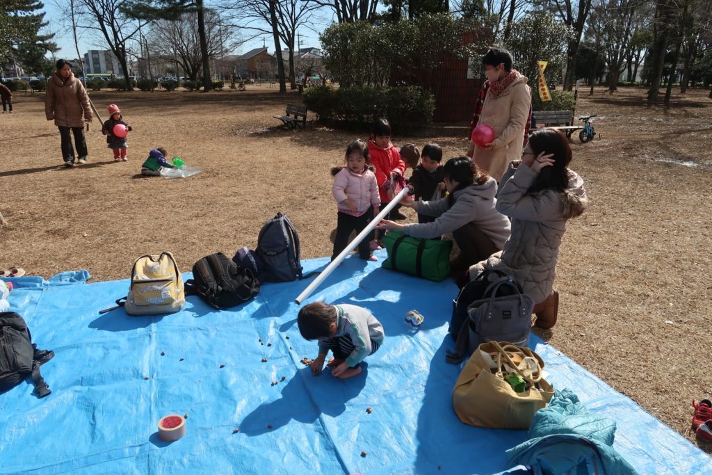パラバルーンやカラービニールのお家も遊びの一つかもしれませんが、まだ今日の段階ではどれも「与えられたもの」にすぎませんでした。一方、どんぐり転がしの方は自分たちでどんどん遊びを発展させていました。こども達が自らやろうとする、それこそが遊びなのだと思います。カラービニールのお家や透明シートも日常的にこども達の手の届くところにあれば、いつかこども達自らで遊ぶようになるでしょう。その時にはじめて「遊び」がスタートするのだと思います。毎日幼稚園に来ないつくし組で、その環境を整えるのは難しいかもしれませんが、今日のどんぐり転がしのような遊びの発展の仕方はできるのではないでしょうか。また一つこども達から学ばせていただきました。ありがとう!