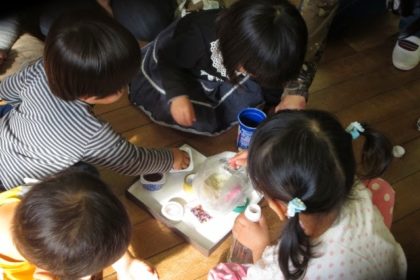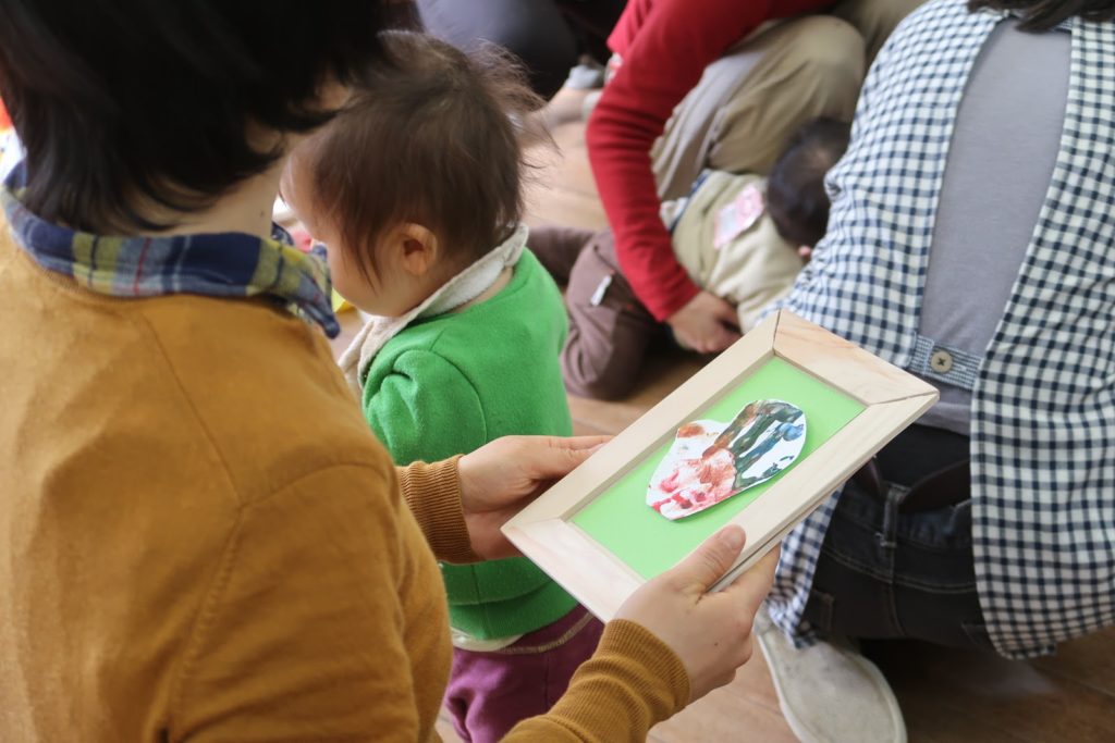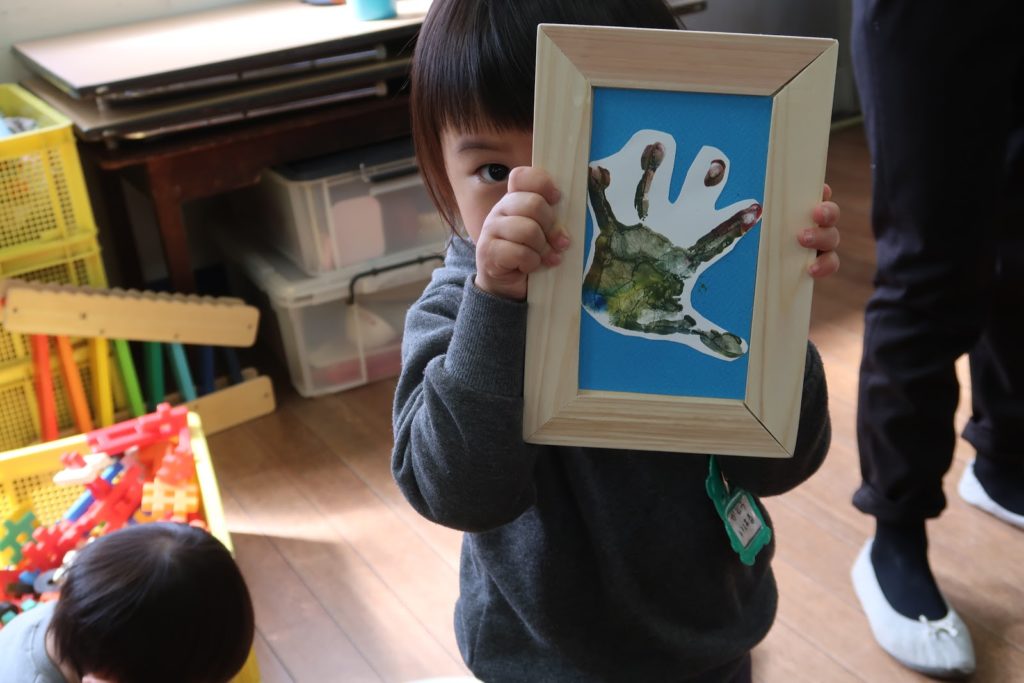 さて、今回のつくし組では絵具あそびをしてから手形をとりました。時として手形は写真よりもリアルにその当時のことを思い起こすことがあります。こども達が大きくなった時、自分の小さな時の思い出はどんな子にも美しく幸せなものであってほしいと願っています。そんな意味も込めまして、手作りでフレームを作りました。