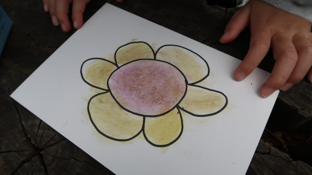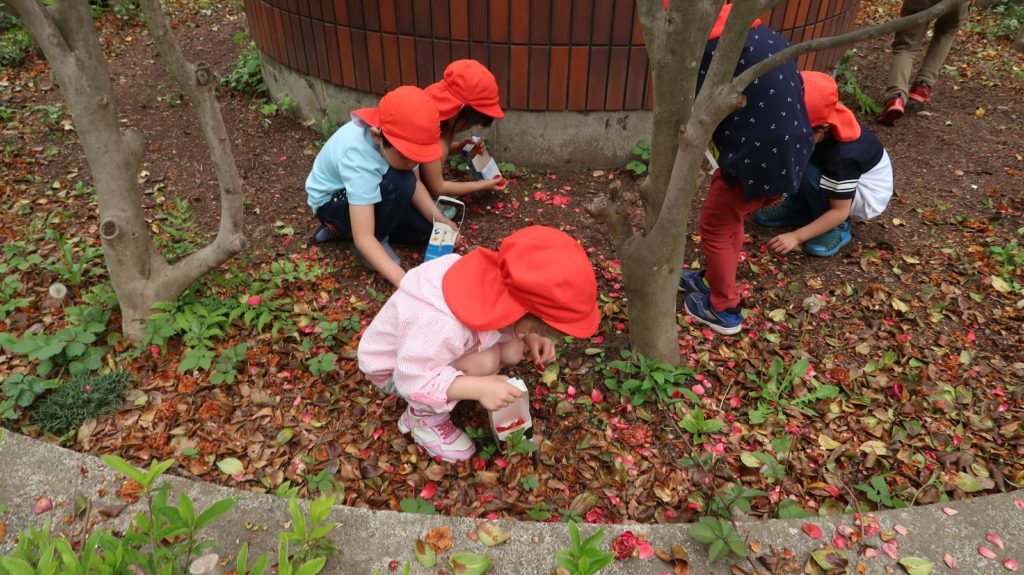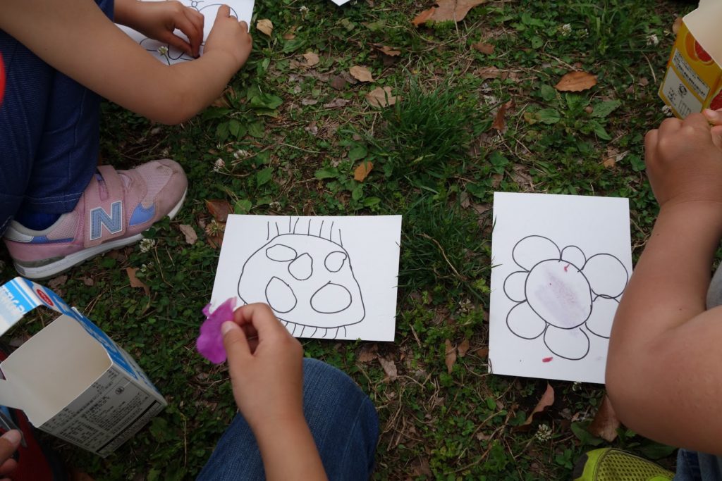 「お花だって葉っぱだって生きてるんだから取っちゃダメ」と大人はよく言ってしまいますよね。けれど、ケロちゃんは「必要な分だけいただいてきて」と言っていました。このような表現のもと、公園の中で緑のもの、ざらざらしたもの、黒いもの、ハートの形をしているものなどを探したり、赤や黄色の花びらを探すとき、こども達は決して乱暴にむしり取ったり、取り過ぎたりすることはありませんでした。むしろ「生きている」ものに関心を持ってこども達は接していたのではないかなと思いました。