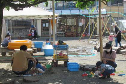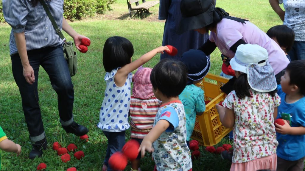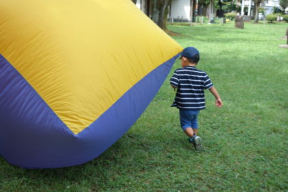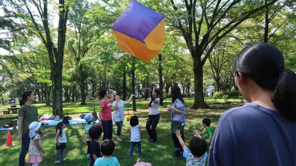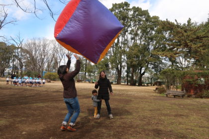 玉入れごっこもしました。みんなでぜーんぶの玉をかごに入れることができました。ただ、私がかごを持ってのろのろ動くもんだから、気味悪がって泣いてしまう子もいました…反省。キューブ型バルーンで遊んだ後は自由あそび。ボールであそんだり、台車であそんだり、いろいろでした。慣れてきた子はそれぞれお母さんが入れ替わってお友達のお母さんと遊んでいたり、体もこころもいっぱい動かして遊んでいたと思います。