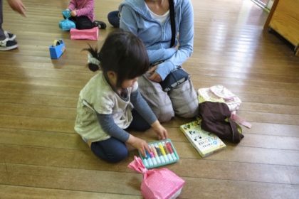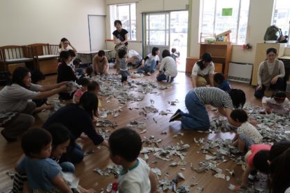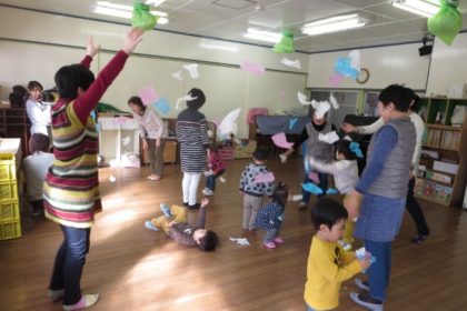 16組の親子があそびに来てくれて、ギターと一緒に歌をうたったり、じゃんけん列車、おおきなかぶ、はてなボックス等をして遊びました。その後はストローを使って、二つの手作りおもちゃを作りました。一つは定番、コップからビニール袋がふわふわと出てくるおもちゃ、もう一つはストローをフーッと吹くと、プロペラが飛び出し、くるくる回りながら落下するおもちゃ。どちらも素敵に出来上がっていました。