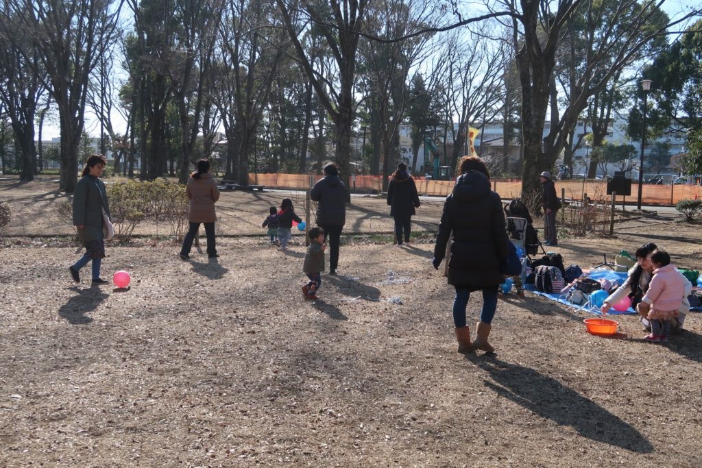 ブルーシートを敷くこともままならない状況の中(しかも世の中インフルエンザ流行中)、今日はお友達、来れるかな?無理かな?と思っておりましたが、なんと11組の親子があそびに来てくれました。はじめにギター伴奏でおなじみの歌をみんなで歌いました。こども達も「あ!知ってる」という感じでノリもよく、本来ならばもう少し歌あそびをしたかったのですが、なにせ容赦なく吹き付ける北風。早く体を動かしたかったのでパラバルーン遊びに移りました。片付けの時、今回もお母さんに手伝ってもらい、円の中心でくるくると回っていただきましたが、ここでも強烈な北風が襲って、パラバルーンが巻き付き、お母さんは十二単を着たようになってしまいました。ごめんなさい。