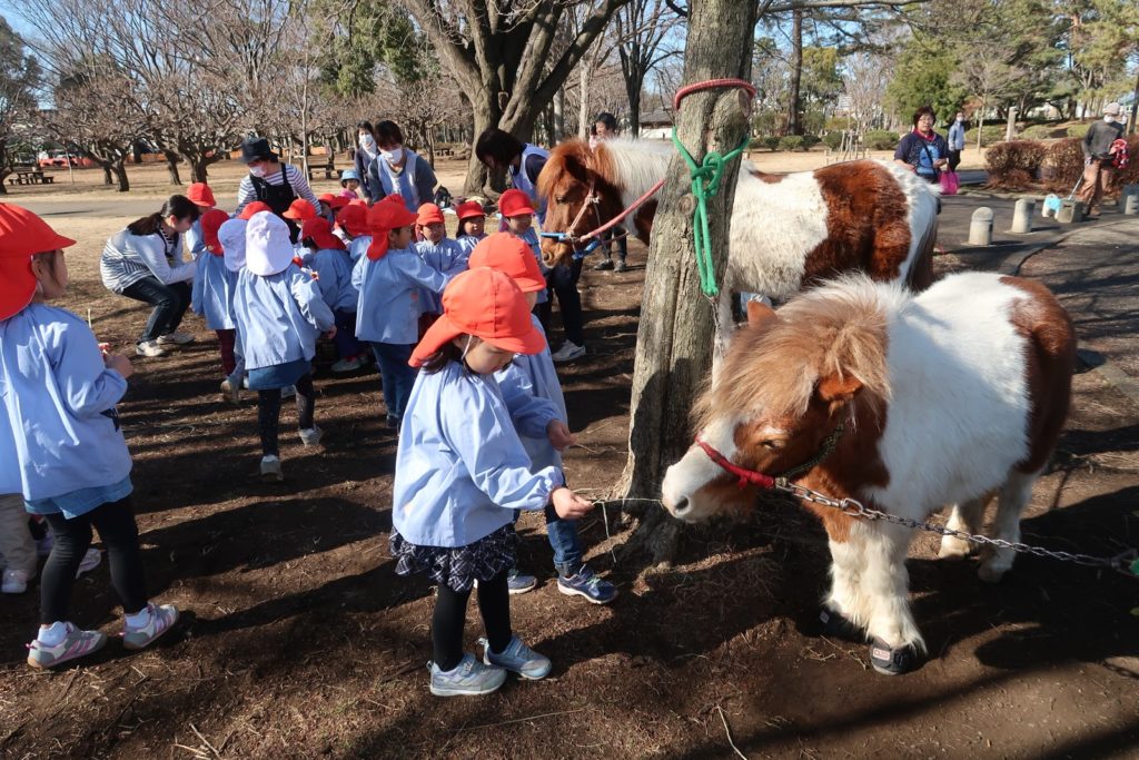 ポニーのチョコちゃんときんたろうくんとの触れ合いも年長さんは今回が最後。