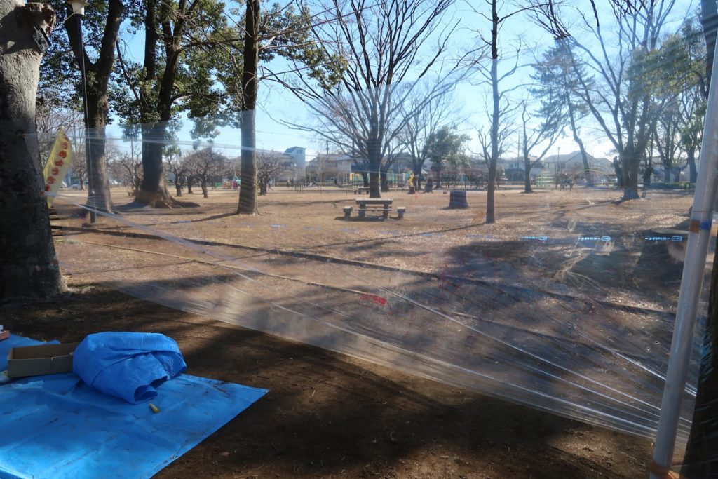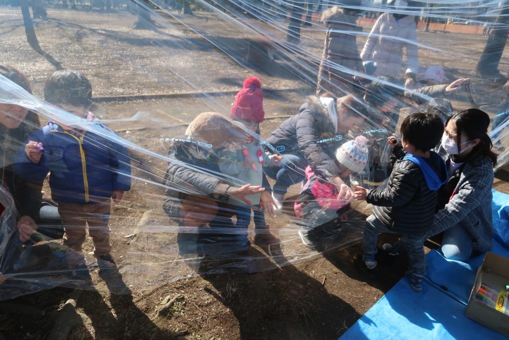 2週間前ほどではありませんでしたが、風がぴゅーぴゅー吹いていました。寒くてどうしようもない、という感じでもなかったと思いますが、今日のあそびで用意したものが大きなビニール…。風圧で破けては補強を重ね、なんとか使うことができました。