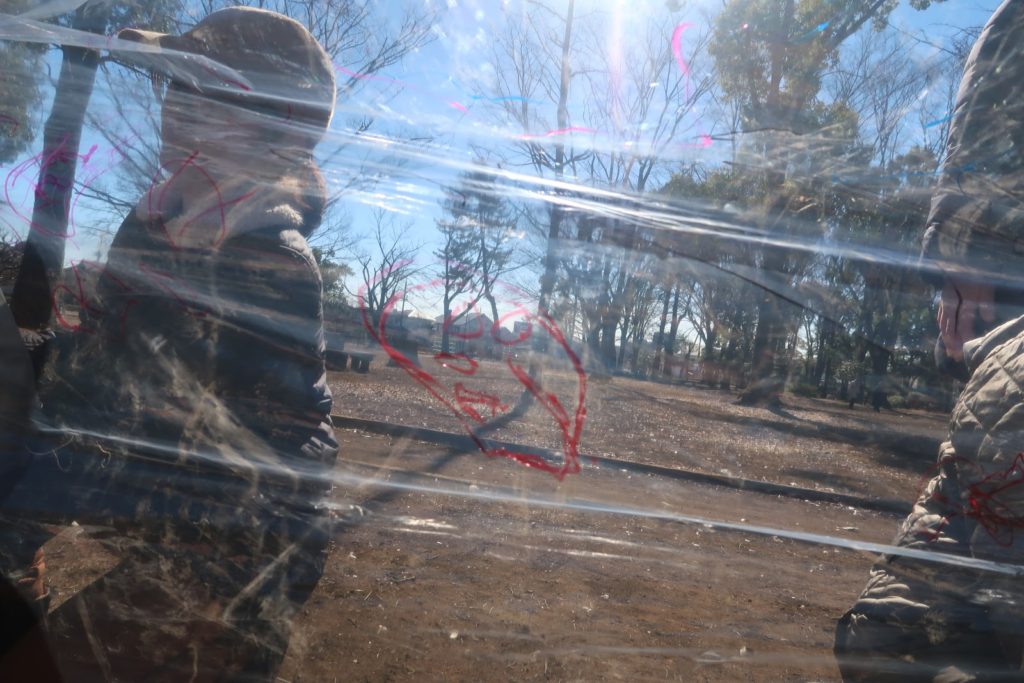 今日はパラバルーンやじゃんけん列車、猛獣狩りなどのいつものあそびに加えて、ビニールを張って落書きコーナーを作りました。マジックでお絵描きしたり、プスッ プスッと穴を開けたりして遊びました。向かい合う人が見えるので予想以上に面白かったと思います。遠めに見ても「なにやってるんだろう…楽しそう」と見えたようで、いろいろな方から話しかけられました。犬のお散歩中の方からも「いつも楽しそうでいいね」と言ってくださいました。