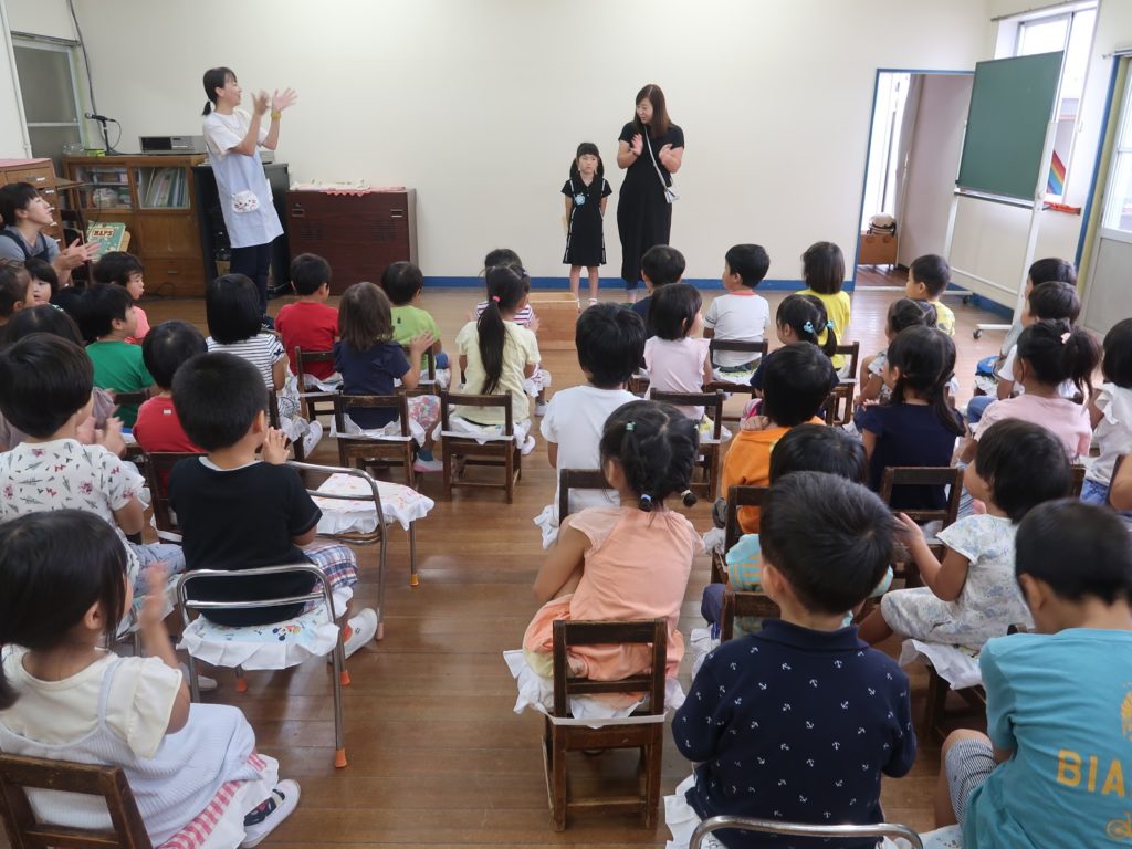 今回はお母さんと担当教師で大型絵本を読みました。みんなの好きなしりとりが出てきて楽しい内容でした。今回ももれなく「アンコール!」の大合唱をこども達からもらい、無事終了しました。