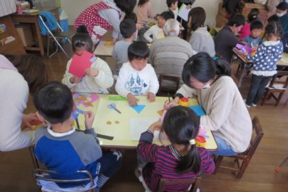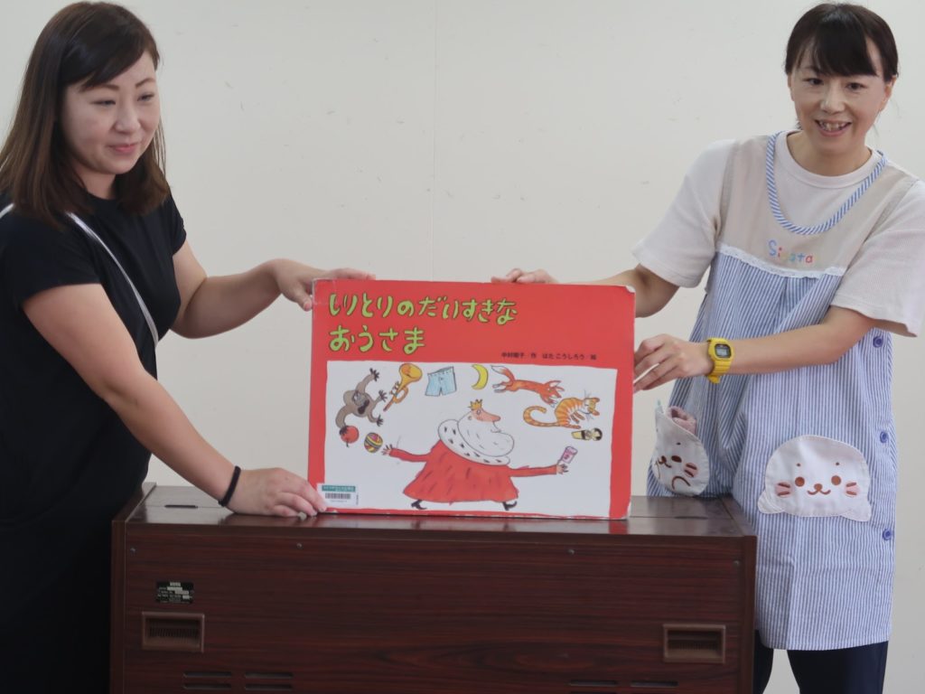 今回はお母さんと担当教師で大型絵本を読みました。みんなの好きなしりとりが出てきて楽しい内容でした。今回ももれなく「アンコール!」の大合唱をこども達からもらい、無事終了しました。