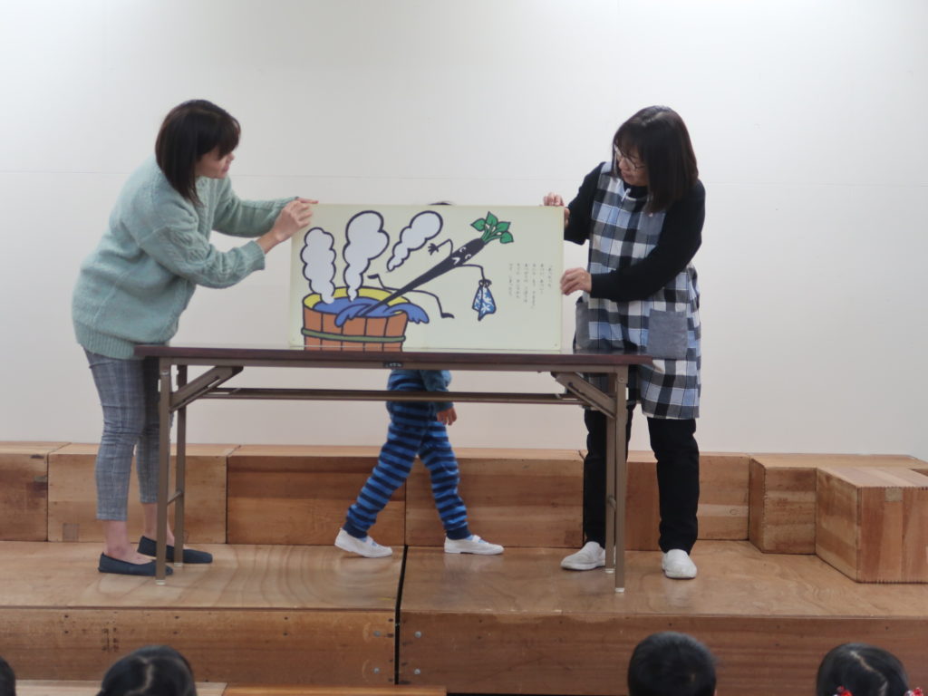 今月はお母さん一人だったので、12月担当の副園長が一緒に大型絵本「にんじんとごぼうとだいこん」を読みました。楽しい時間を過ごすことができました。ご協力ありがとうございました。