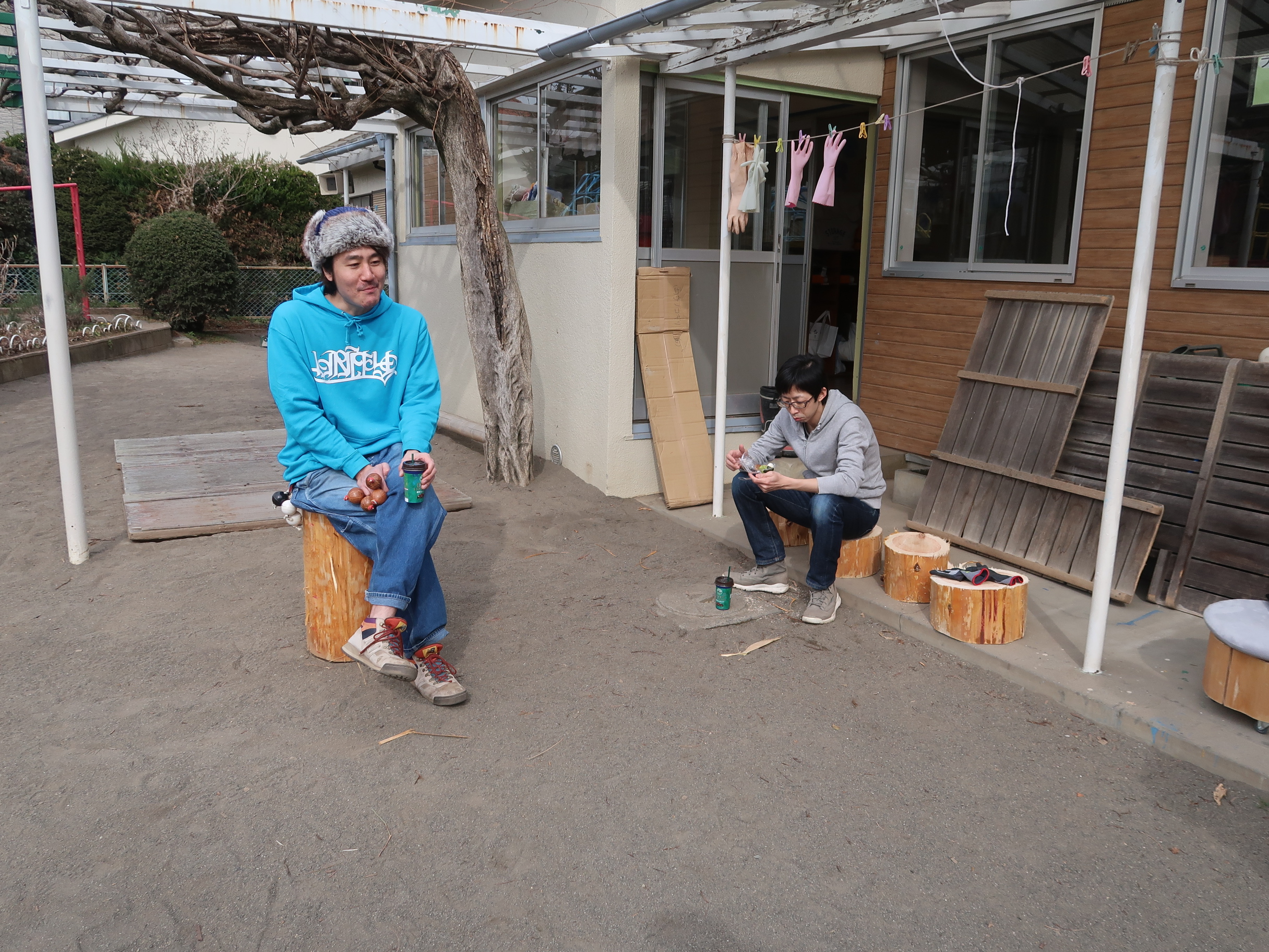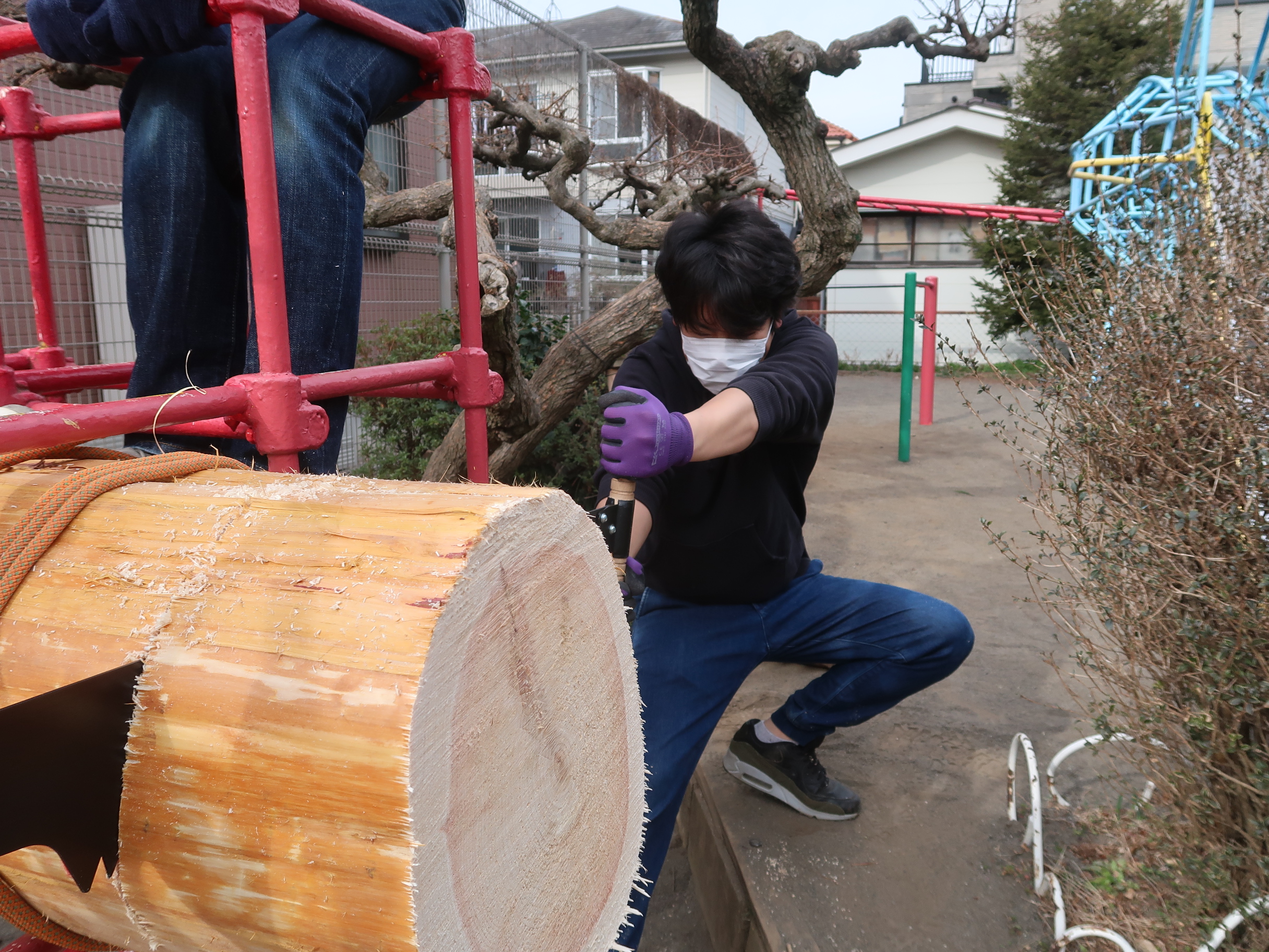直径25cm~35cmの大きな丸太なので普通ののこぎりではとても大変です。ですから、「森と市庭」さんから大きな両手引きのこぎりをお借りしました。とはいえ、やはり切るのは大変です。はぁはぁ言いながら、かなりの重労働でした。最初はまっすぐ垂直に切るのも難しく斜めになったりしていましたが、そのうちだんだんコツをつかむようになり、そんなに力を入れなくてもスッスッとまっすぐ切ることが出来るようになりました。いろいろ試行錯誤しながら呼吸がだんだん合ってくる感じはこども達のあそびと共通する部分があり、面白かったです。ぺちゃくちゃ話しながら楽しく重労働することができました。丸太切りの他にも丸太の皮むきや木の枝の皮削りなどもしていただきました。感謝。