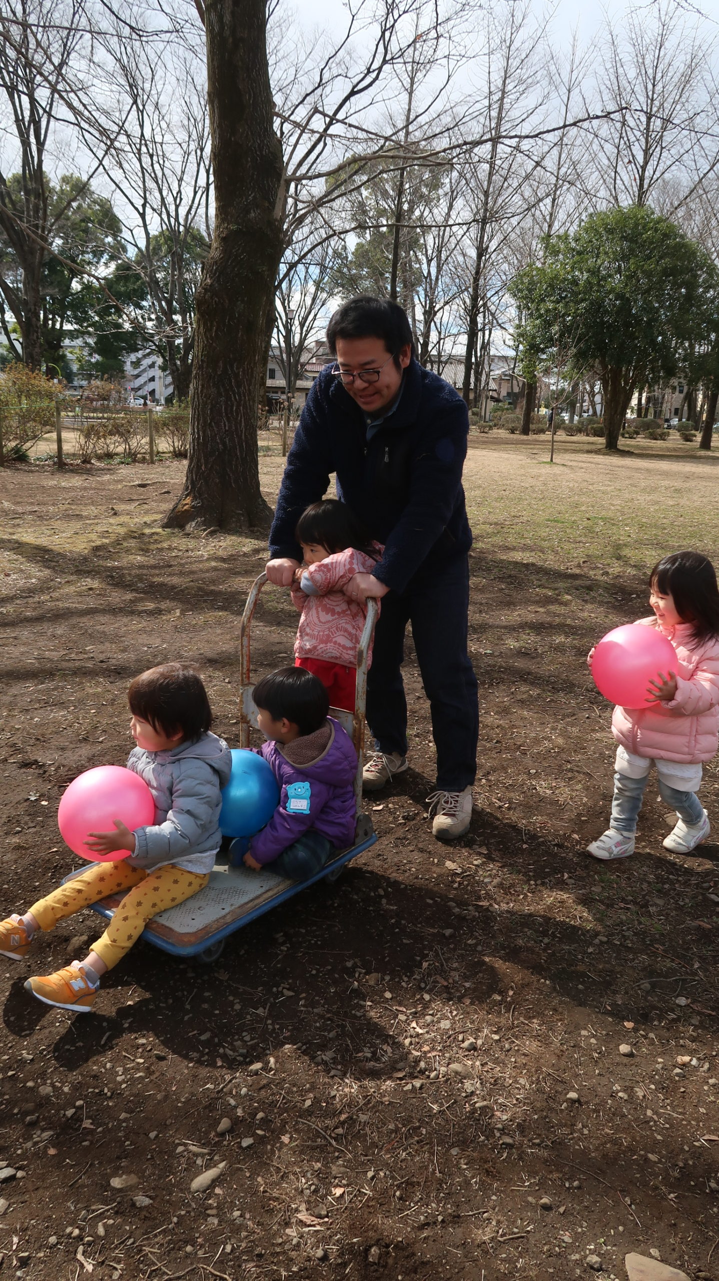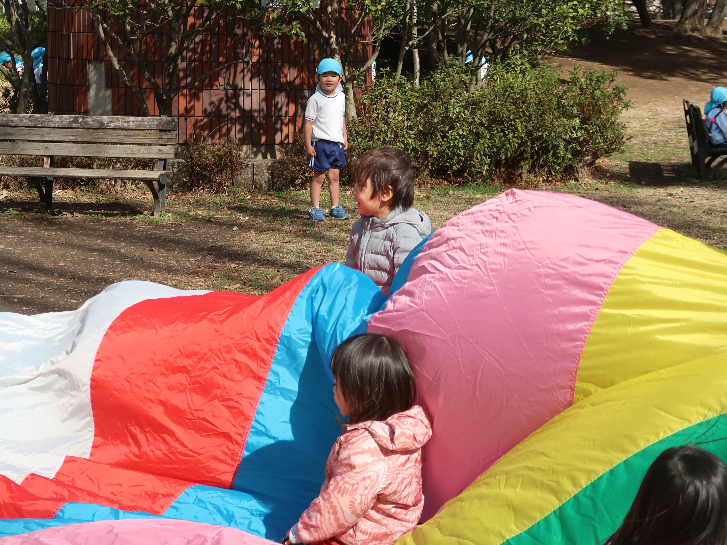 今日は人数が少なかったので、最初は遊具で遊びました。あまり若草公園の遊具を使って遊ぶことは幼稚園の中ではないので、新鮮でした。一頻り遊んだ後はパラバルーンやボール、キューブバルーンで遊びました。中でも面白かったのは台車を電車として遊んだこと。順番で争うこともなく、気持ちいいくらい譲ってくれてみんなで遊ぶことが出来ました。