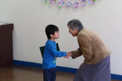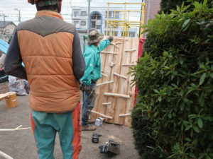青梅幼稚園の園庭で丸太をいじっているおじさん達がいます。