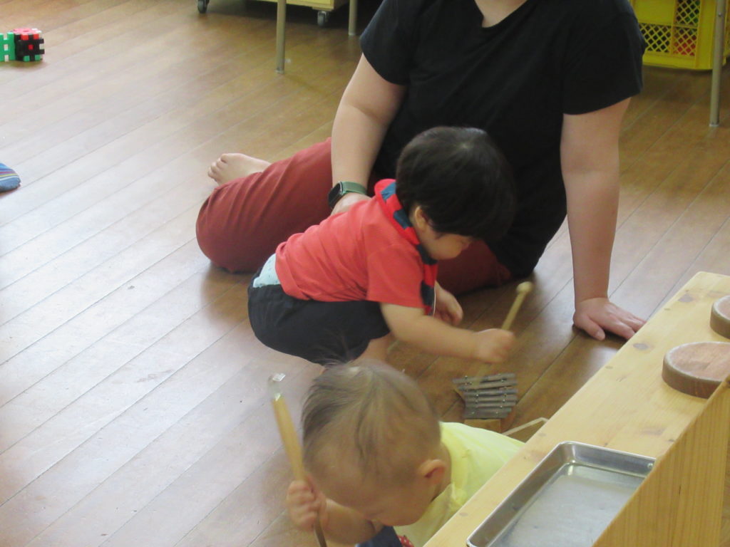 今日は園庭開放(フリールームも)のような形でおこないました。結局、午前中は小雨が降る時間帯が多かったですが、1歳の小さなお友達は私たちの予想を超えて元気でした。ずんずんお外にも行くし、お部屋でも約2時間よく遊べていました。2歳のお友達も設置された健康体操の巧技台を自分の力でどうやって渡ることができるか考えながらチャレンジできていました。とても穏やかな時間が流れていましたね。