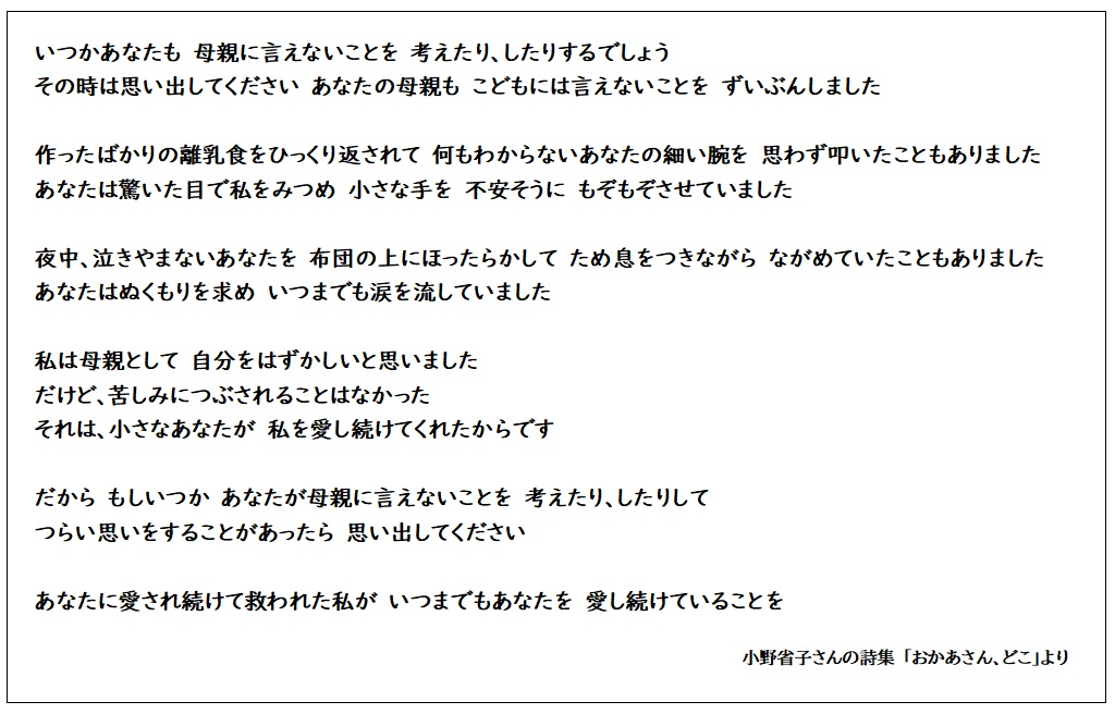 誰だって経験があると思います。私もそうです。けれども、これこそが「共に育つ」ということなのだとも思います。こどもを育てながら親も育つ…正面から自分と向き合うからこそ与えられるこの経験は何物にも代えがたいものです。小野省子さんは別の詩の中で、「娘の夜泣きがひびくキッチンで一人、私が渇望したのは なぐさめや説教や、叱咤激励ではなく、ただの……共感だった」と書いています。心が砕かれるような思いは本当につらいことですが、その分だけ他者に共感することができるようになります。この支え合いこそが子育て支援であり、「一人じゃないさ」と私たち保育に関わるものが発信しなければならないことだと思っています。