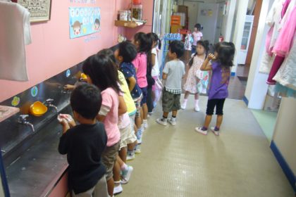 ・保育室 トイレ 廊下 水道 テーブル 椅子 おもちゃ等、共有して使用する場所の消毒。