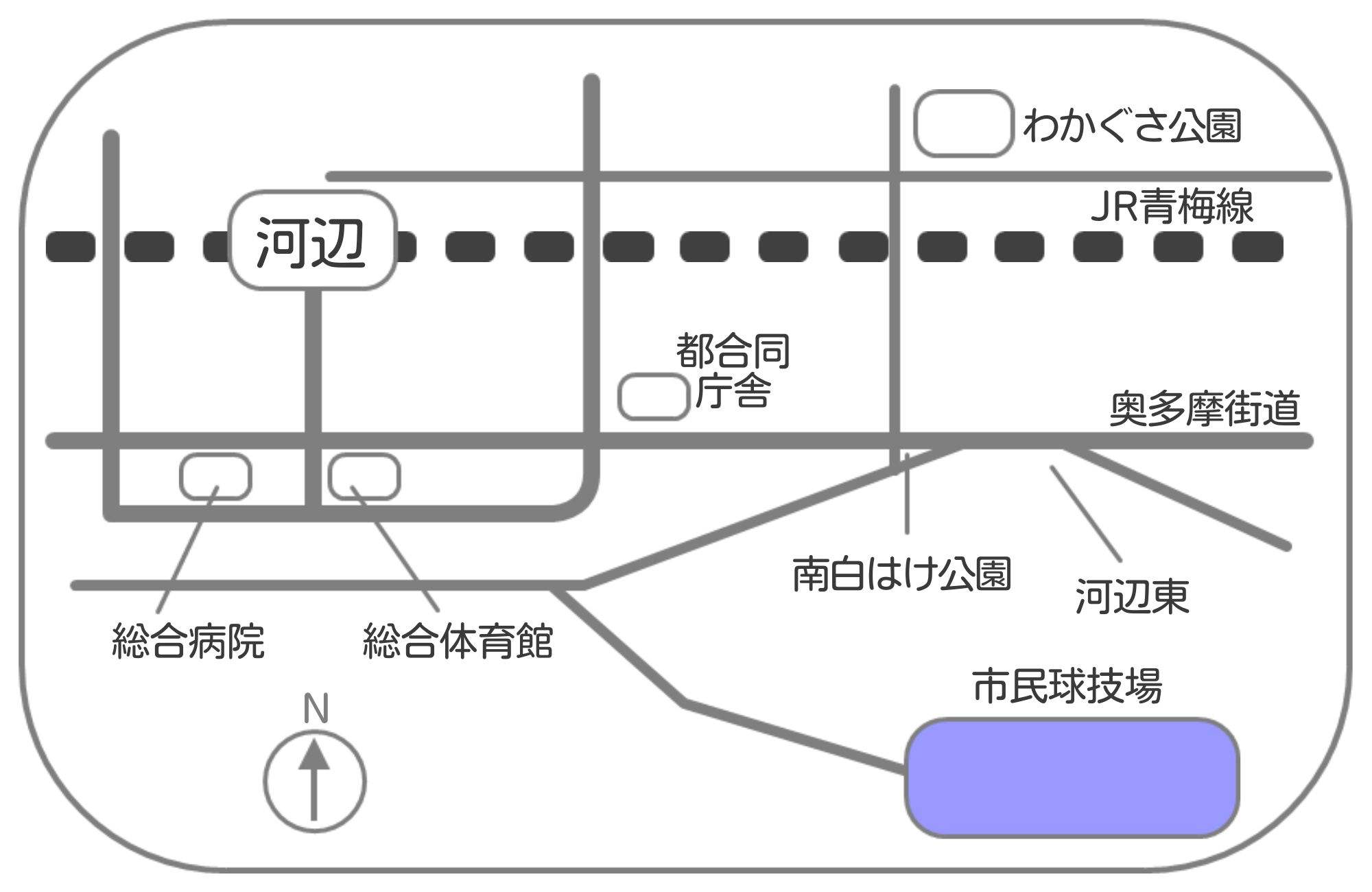 下記地図 市民球技場 青梅市河辺町1丁目872−1を目指してください。