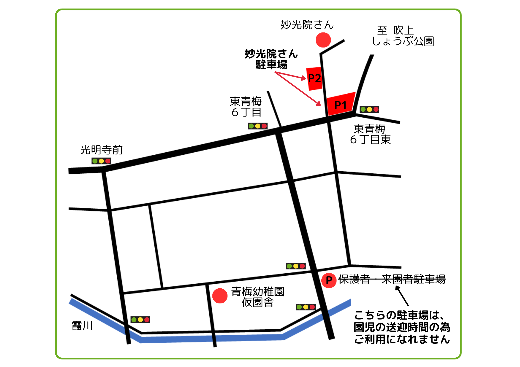※ 園の『保護者・来園者駐車場』は園児の登園時間のためご利用いただけませんが、妙光院さんの駐車場をお借りする事ができました。車でいらっしゃる方は下の地図をご確認の上ご利用ください。園から少し離れておりますので、時間に余裕を持ってお越しください。