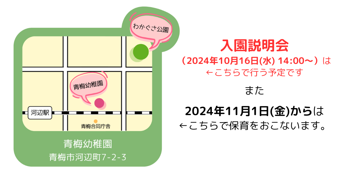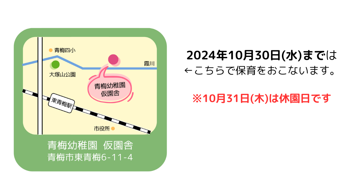 ※入園案内書のお渡しは、10月30日(水)までは仮園舎(東青梅6-11-4)で、11月1日(金)からは新園舎(河辺町7-2-3)でおこないます。10月31日(木)は引っ越しのため休園となりますのでご了承ください。