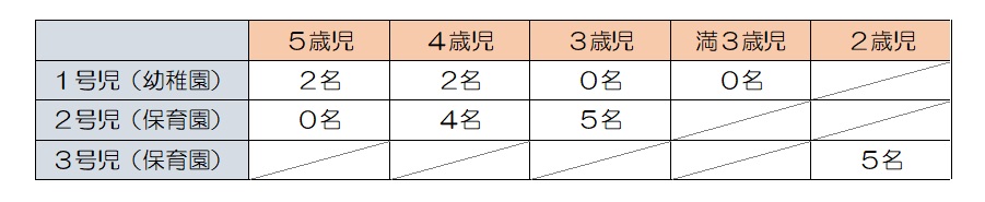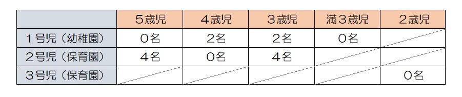 認定こども園への移行に伴い、定員に対する空き状況が下表のようになりましたので、見学や入園をお考えの方はどうぞお気軽にお問い合わせください。