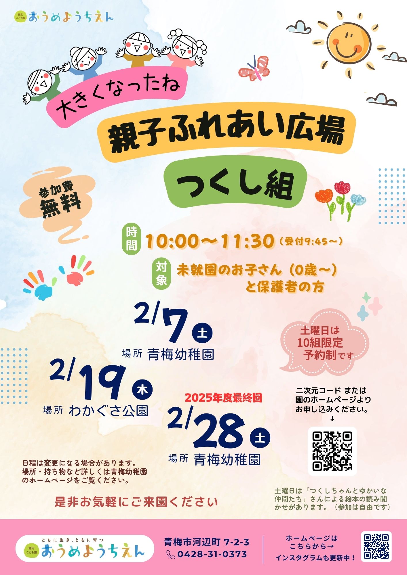 青梅幼稚園のつくし組も、2月は3回開催します。