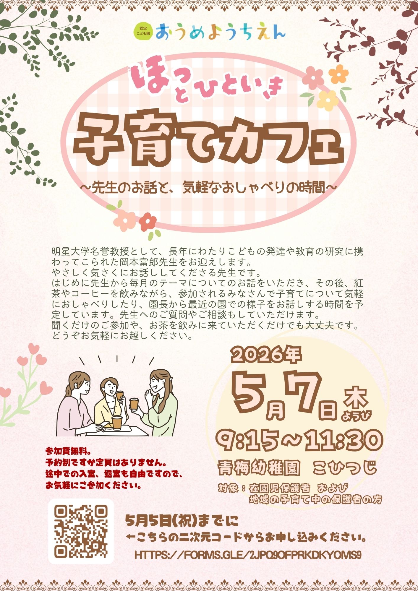 明星大学名誉教授として、長年にわたりこどもの発達や教育の研究に携わってこられた岡本富郎先生をお迎えし、毎月のテーマについてお話しいただきます。あわせて、園長より最近の園での様子をお伝えし、その後は紅茶やコーヒーを飲みながら、子育てについて気軽におしゃべりする時間を予定しています。